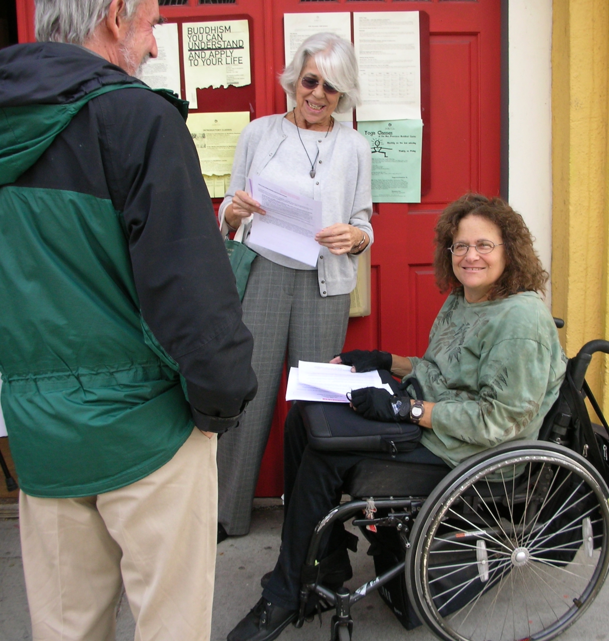Not Dead Yet activists trying to gate-crash Exit’s 2009 San Francisco Meeting at the Buddhist Centre